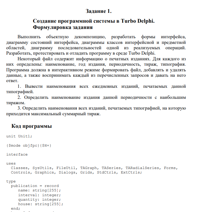 Выполнить объектную декомпозицию, разработать формы интерфейса, диаграмму состояний интерфейса, диаграммы классов интерфейсной и предметной областей, диаграмму последовательностей одной из реализуемых операций. Разработать, протестировать и отладить программу в среде Turbo Delphi. Некоторый файл содержит информацию о печатных изданиях. Для каждого из них определены: наименование, год издания, периодичность, тираж, типография. Программа должна в интерактивном режиме формировать файл, добавлять и удалять данные, а также воспринимать каждый из перечисленных запросов и давать на него ответ. 1. Вывести наименования всех ежедневных изданий, печатаемых данной типографией. 2. Определить наименование издания данной периодичности с наибольшим тиражом. 3. Определить наименования всех изданий, печатаемых типографией, на которую приходится максимальный суммарный тираж.