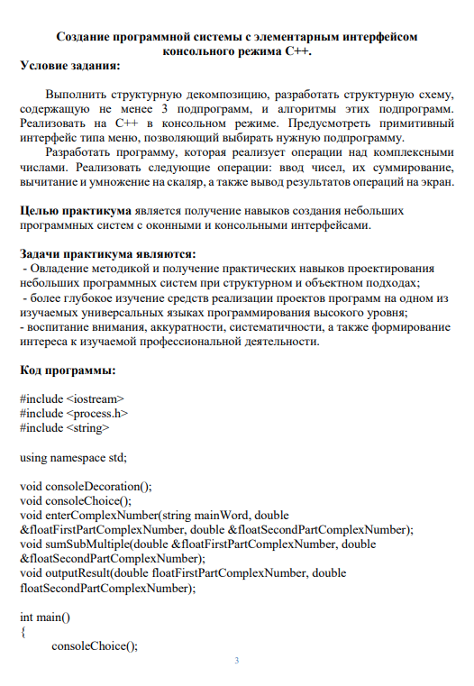 Выполнить структурную декомпозицию, разработать структурную схему, содержащую не менее 3 подпрограмм, и алгоритмы этих подпрограмм. Реализовать на С++ в консольном режиме. Предусмотреть примитивный интерфейс типа меню, позволяющий выбирать нужную подпрограмму. Разработать программу, которая реализует операции над комплексными числами. Реализовать следующие операции: ввод чисел, их суммирование, вычитание и умножение на скаляр, а также вывод результатов операций на экран.