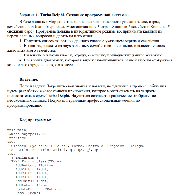 Задание 1. Turbo Delphi. Создание программной системы. В базе данных «Мир животных» для каждого животного указаны класс, отряд, семейство, вид (например, класс Млекопитающие * отряд Хищные * семейство Кошачьи * снежный барс). Программа должна в интерактивном режиме воспринимать каждый из перечисленных вопросов и давать на него ответ. 1. Получить список животных данного класса с указанием отряда и семейства. 2. Выяснить, в каком из двух заданных семейств видов больше, и вывести список животных этого семейства. 3. Выяснить, к какому классу, отряду, семейству принадлежит данное животное. 4. Построить диаграмму, которая в виде прямоугольников разной высоты отображает количество отрядов в каждом классе.