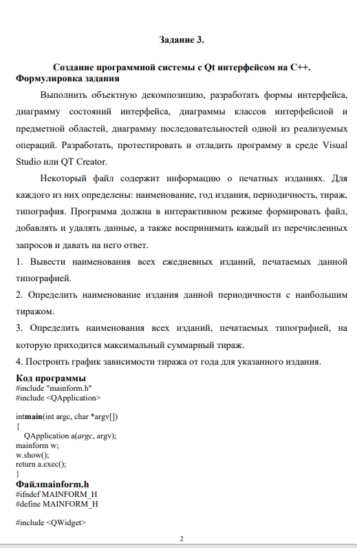 Выполнить объектную декомпозицию, разработать формы интерфейса, диаграмму состояний интерфейса, диаграммы классов интерфейсной и предметной областей, диаграмму последовательностей одной из реализуемых операций. Разработать, протестировать и отладить программу в среде Visual Studio или QT Creator. Некоторый файл содержит информацию о печатных изданиях. Для каждого из них определены: наименование, год издания, периодичность, тираж, типография. Программа должна в интерактивном режиме формировать файл, добавлять и удалять данные, а также воспринимать каждый из перечисленных запросов и давать на него ответ. 1. Вывести наименования всех ежедневных изданий, печатаемых данной типографией. 2. Определить наименование издания данной периодичности с наибольшим тиражом. 3. Определить наименования всех изданий, печатаемых типографией, на которую приходится максимальный суммарный тираж. 4. Построить график зависимости тиража от года для указанного издания