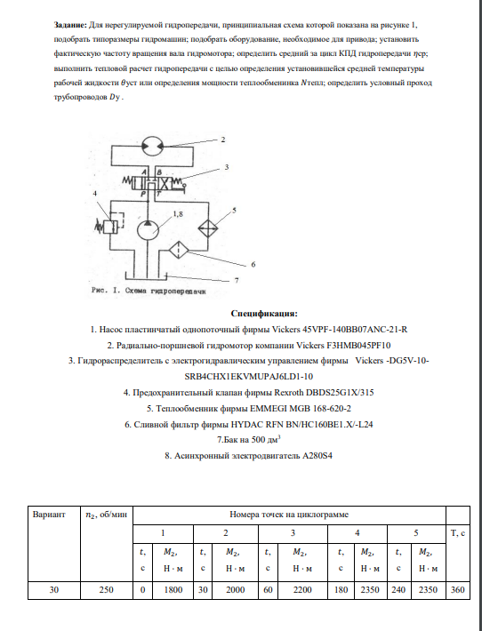 Задание: Для нерегулируемой гидропередачи, принципиальная схема которой показана на рисунке 1, подобрать типоразмеры гидромашин; подобрать оборудование, необходимое для привода; установить фактическую частоту вращения вала гидромотора; определить средний за цикл КПД гидропередачи