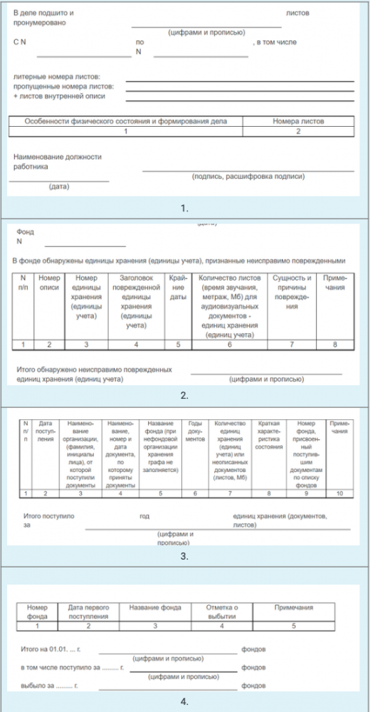для учета в рамках архивного фонда, архивной коллекции количества и состава описей и их нумерации, количества и состава документов, состояния их описания, динамики изменений по каждой описи и фонду (коллекции) в целом, фиксации изменений по каждой описи и фонду (коллекции) в целом, фиксации изменений в названии фонда | |