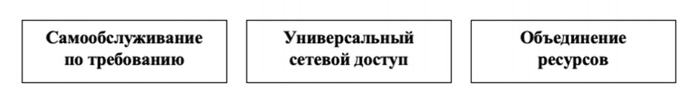 - самообслуживание по запросу (on-demand self-service), широкий сетевой доступ (Broad network access), измеряемый сервис (Measured service) и др.