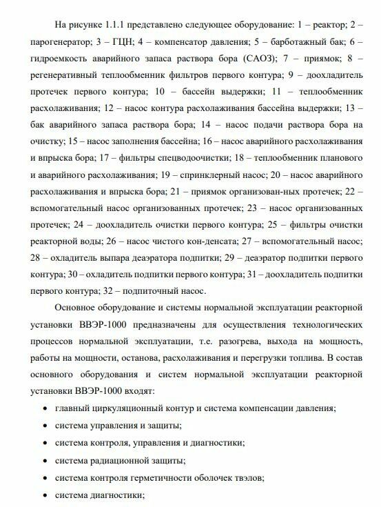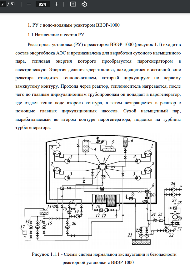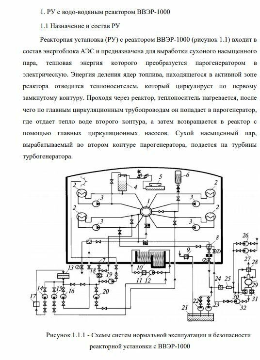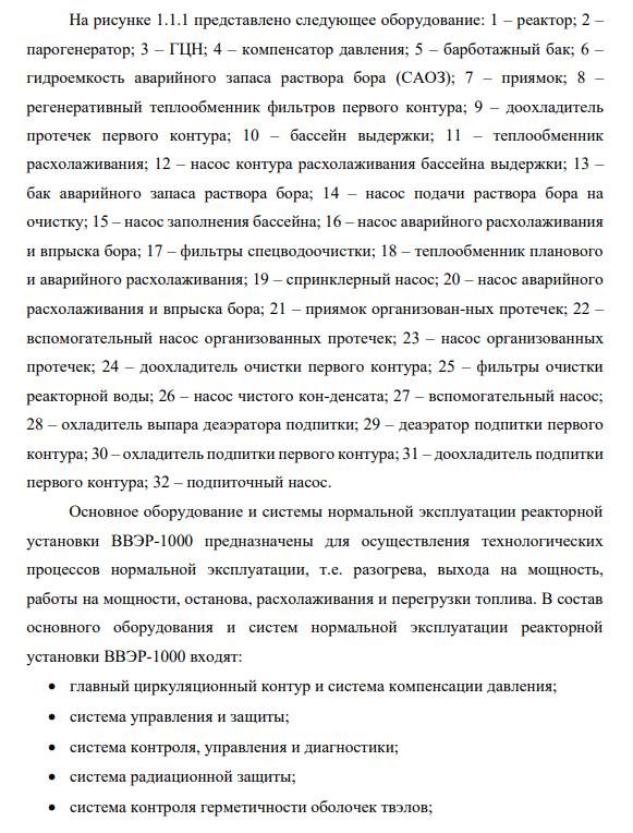 На рисунке 1.1.1 представлено следующее оборудование: 1 – реактор; 2 – парогенератор; 3 – ГЦН; 4 – компенсатор давления; 5 – барботажный бак; 6 – гидроемкость аварийного запаса раствора бора (САОЗ); 7 – приямок; 8 – регенеративный теплообменник фильтров первого контура; 9 – доохладитель протечек первого контура; 10 – бассейн выдержки; 11 – теплообменник расхолаживания; 12 – насос контура расхолаживания бассейна выдержки; 13 – бак аварийного запаса раствора бора; 14 – насос подачи раствора бора на очистку; 15 – насос заполнения бассейна; 16 – насос аварийного расхолаживания и впрыска бора; 17 – фильтры спецводоочистки; 18 – теплообменник планового и аварийного расхолаживания; 19 – спринклерный насос; 20 – насос аварийного расхолаживания и впрыска бора; 21 – приямок организованных протечек; 22 – вспомогательный насос организованных протечек; 23 – насос организованных протечек; 24 – доохладитель очистки первого контура; 25 – фильтры очистки реакторной воды; 26 – насос чистого конденсата; 27 – вспомогательный насос; 28 – охладитель выпара деаэратора подпитки; 29 – деаэратор подпитки первого контура; 30 – охладитель подпитки первого контура; 31 – доохладитель подпитки первого контура; 32 – подпиточный насос.
