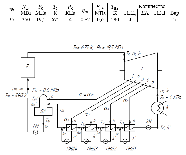 Заданы: электрическая мощность Nэл, давление P0 и температура T0 пара на входе в турбину, давление на выхлопе из турбины Pк, относительный внутренний к.п.д. турбины , температура питательной воды Tпв, давление в деаэраторе Pда, наличие и число ПНД и ПВД, схема включения дренажей ПНД.