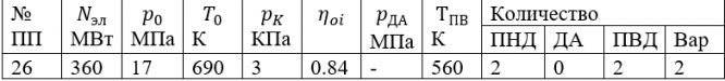 В результате расчета требуется найти температуру рабочей среды на входе и выходе из элементов оборудования контура, параметры и величину расхода пара в отборах на регенеративный подогрев, расход пара на турбину, абсолютный КПД брутто установки.