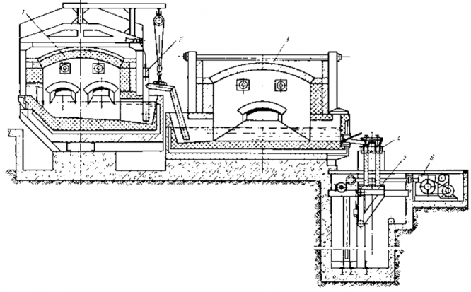 1 — печь; 2 — сифон для перелива металла; 3 — миксер; 4 — кристаллизатор; 5 — литейная машина; 6 — привод литейной машины