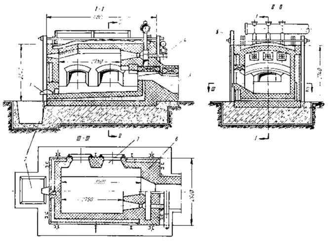 1 — летка и желоб; 2 — яма для ковша; 3 — дымоход; 4 — горелки; 5 — металлический каркас; 6 — огнеупорная кладка; 7 — завалочное окно