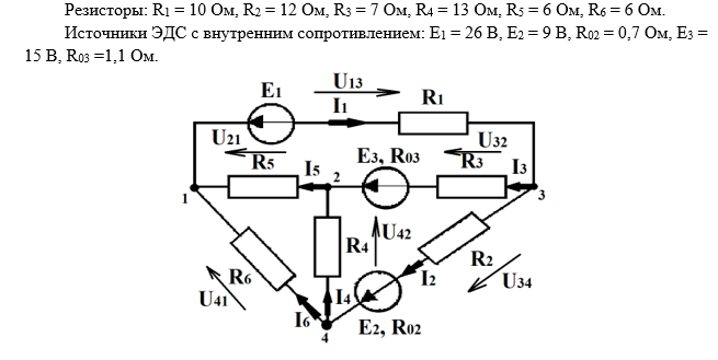 1.3. Составить необходимое для расчёта цепи число уравнений по первому и второму законам Кирхгофа.