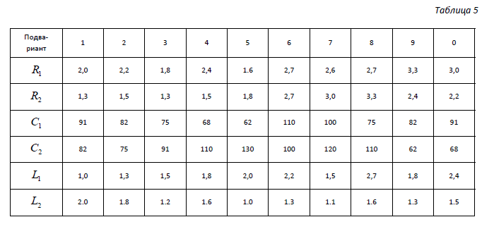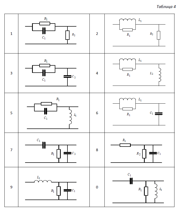 ЛИС-цепь определяется схемой согласно варианту (табл. 4), ее параметры ( в кОм, в пФ, в мГн ) – согласно подварианту (табл. 5). Однотипные элементы нумеруются в соответствии с их расположением на схеме: слева направо и сверху вниз. Предполагается, что выход цепи подключен к устройству с бесконечным входным сопротивлением.