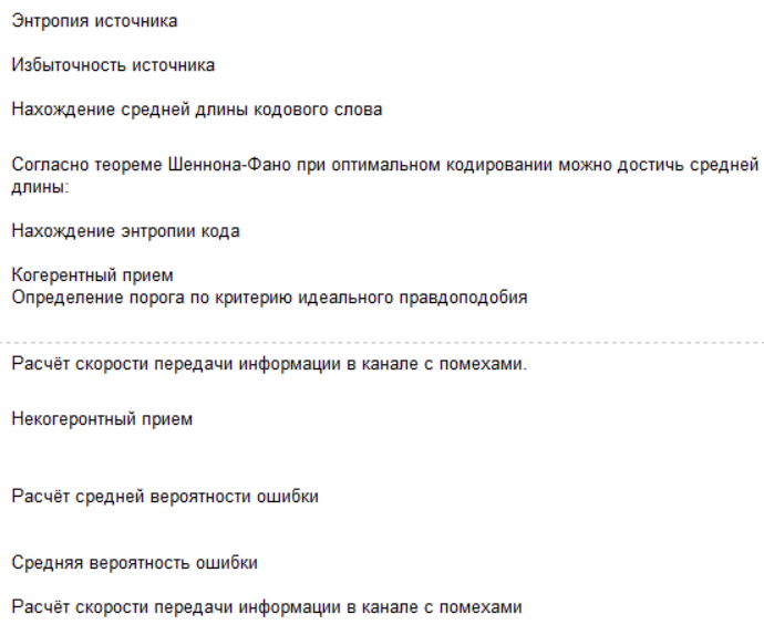 - Расчет вероятностей двоичных символом, передаваемых по каналу; энтропии и избыточности кода.