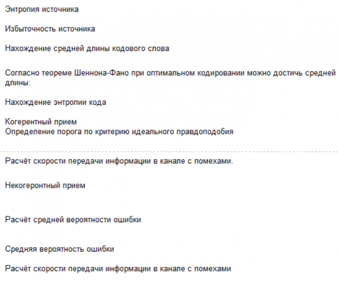 • Расчет вероятностей двоичных символом, передаваемых по каналу; энтропии и избыточности кода.