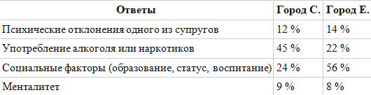 Российская центр «Анна» проводил социологический опрос в городе С. и в городе Е. на тему «Причины насилия в семье». Проанализируйте полученную информацию. Какой вывод можно сделать на основании таблицы?