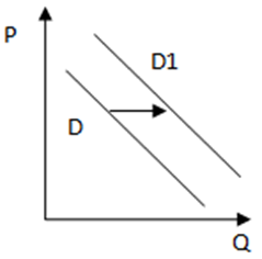 На рисунке отражена ситуация на рынке овощей и фруктов: линия спроса D переместилась в новое положение D1 (P – цена товара, Q – объем спроса товара).