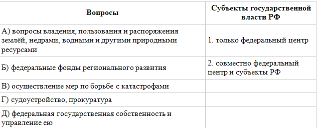 Установите соответствие между вопросами и субъектами государственной власти РФ, к ведению которых эти вопросы относятся: к каждой позиции, данной в первом столбце, подберите соответствующую позицию из второго столбца.