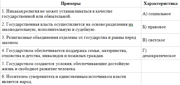 Установите соответствие между характеристиками государства и конкретными примерами, их иллюстрирующими: к каждой позиции первого столбца подберите соответствующую позицию из второго.