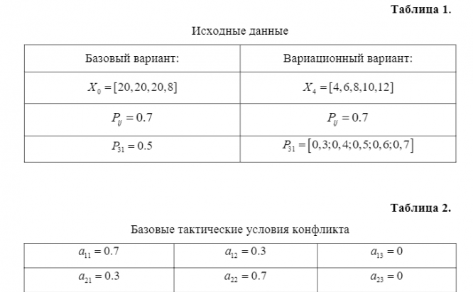 Целью работы является изучение методики прогноза динамики конфликта ЛС СВН и ЛС ПВО на основе СТЭК, а также влияния различных параметров конфликтующих сторон на ход конфликта. Необходимо получить в ПС «МОМДИС » конфликтно-оптимальное распределение долей численностей 1 q и 1 q на основе СТЭК-1 и СТЭК-7 в базовом варианте конфликта для двух тактов взаимодействия, а также путем вариации параметров конфликтующих систем в пределах заданных интервалов исследовать влияние изменения эффективности поражения Pij и начальных численностей i x на результат противодействия.