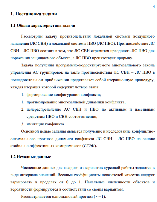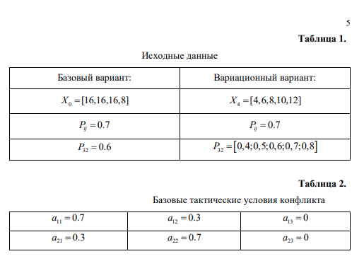 Целью работы является изучение методики прогноза динамики конфликта ЛС СВН и ЛС ПВО на основе СТЭК, а также влияния различных параметров конфликтующих сторон на ход конфликта. Необходимо получить в ПС «МОМДИС» конфликтно-оптимальное распределение долей численностей 1 q и 2 q на основе СТЭК-1 и СТЭК-7 в базовом варианте конфликта для двух тактов взаимодействия, а также путем вариации параметров конфликтующих систем в пределах заданных интервалов исследовать влияние изменения эффективности поражения Pij и начальных численностей i x на результат противодействия.
