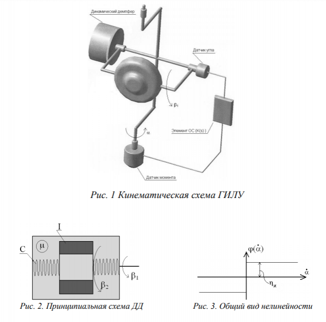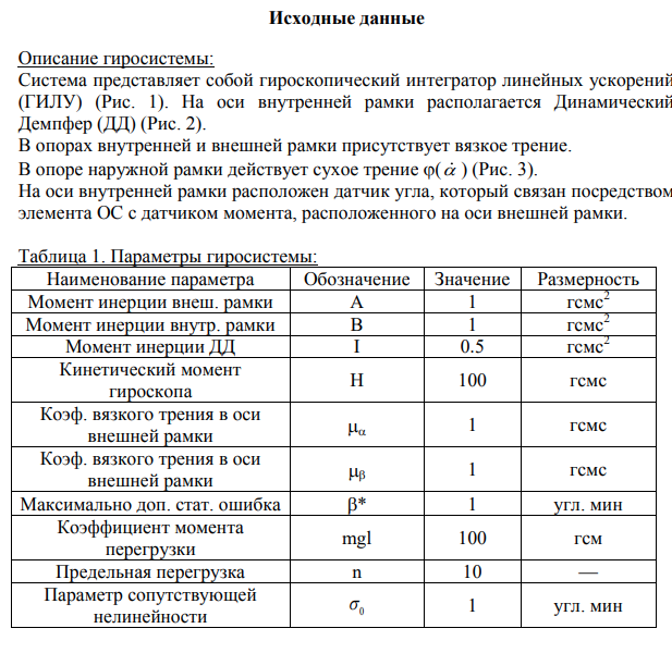 Описание гиросистемы: Система представляет собой гироскопический интегратор линейных ускорений (ГИЛУ) (Рис. 1). На оси внутренней рамки располагается Динамический Демпфер (ДД) (Рис. 2). В опорах внутренней и внешней рамки присутствует вязкое трение. В опоре наружной рамки действует сухое трение ( ) (Рис. 3). На оси внутренней рамки расположен датчик угла, который связан посредством элемента ОС с датчиком момента, расположенного на оси внешней рамки.