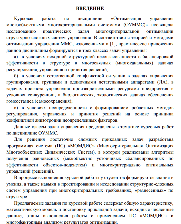 Курсовая работа по дисциплине «Оптимизация управления многообъектными многокритериальными системами (ОУММС)» посвящена исследованию практических задач многокритериальной оптимизации структурно-сложных систем управления. В соответствии с теорией и методами оптимизации управления ММС, изложенными в [1], практические приложения данной дисциплины формируются в трех классах задач управления: а) в условиях исходной структурной несогласованности с балансировкой эффективности в структуре в многосвязных (многоканальных) задачах регулирования, управления и принятия решений; б) в условиях естественной конфликтной ситуации в задачах управления группировками, группами и одиночными летательными аппаратами (JIA), в задачах прогноза управления производственными ресурсами предприятия в условиях конкуренции, в биологических, экологических задачах обеспечения гомеостазиса (самосохранения); в) в условиях неопределенности с формированием робастных методов регулирования, управления и принятия решений на основе принципа конфликтной анизотропии неопределенных факторов.