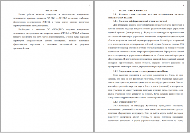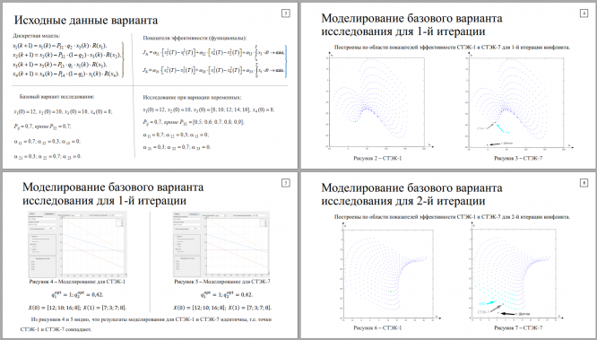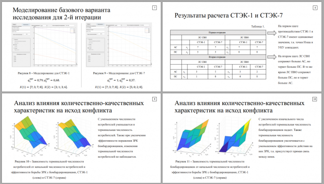Целью работы является получение и исследование конфликтнооптимального прогноза динамики ЛС СВН – ЛС ПВО на основе стабильноэффективных компромиссов (СТЭК), а также анализ влияния различных параметров модели на ход конфликта.Необходимо с помощью ПС «МОМДИС» получить конфликтнооптимальное распределение сил сторон на основе СТЭК-1 и СТЭК-7 в базовом варианте конфликта для двух тактов взаимодействия, а также путем вариации параметров конфликтующих систем исследовать влияние изменения эффективности поражения и начальных численностей на результат