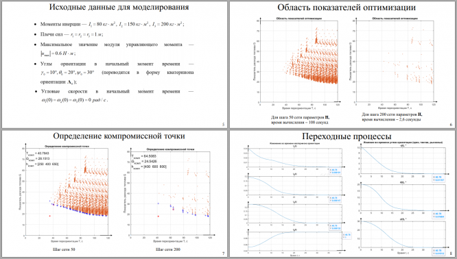 Рассматривается задача переориентации космического летательного аппарата (КЛА) с двумя критериями оптимизации: минимизации времени переориентации (быстродействие) и минимизации расхода топлива на разворот. Для решения задачи требуется составить нелинейную динамическую модель высокой размерности; выбрать структуру управления, позволяющую достичь максимальной эффективности по обоим критериям; определить (идеальную) утопическую точку и, используя метод многокритериальной оптимизации на основе утопической точки, найти Парето-оптимальное решение.