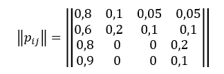Система вооружения находится в режиме постоянного дежурства. Боевой расчет, обслуживающий систему, меняется каждые сутки (шаг процесса). Возможны четыре состояния системы Si, (i=1…4): S1 - полностью готова к использованию (показатель готовности системы r=1); S2 – в системе проводятся регламентные работы, r=0,5; S3 – проводятся учебно-тренировочные занятия боевого расчета, r=0; S4 – аварийный режим работы в условиях автономного жизнеобеспечения системы, r=1. Матрица переходных (условных) вероятностей: