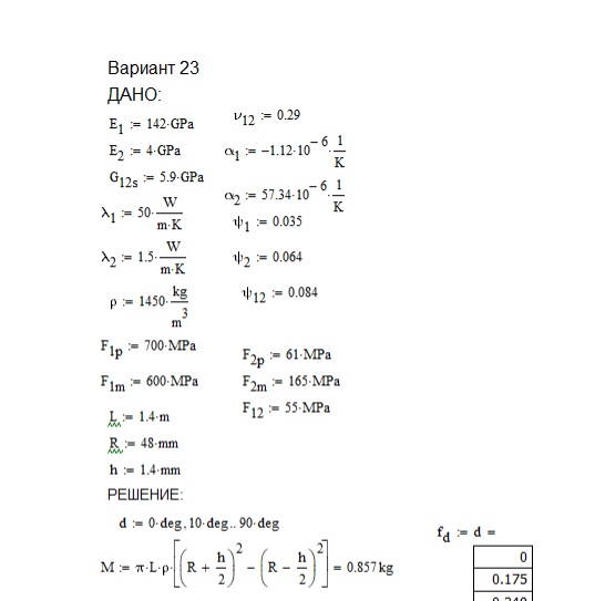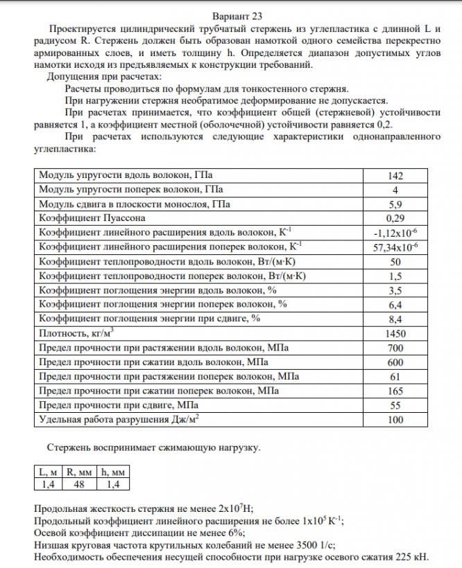 Вариант 23 Проектируется цилиндрический трубчатый стержень из углепластика с длинной L и радиусом R. Стержень должен быть образован намоткой одного семейства перекрестно армированных слоев, и иметь толщину h. Определяется диапазон допустимых углов намотки исходя из предъявляемых к конструкции требований. Допущения при расчетах: Расчеты проводиться по формулам для тонкостенного стержня. При нагружении стержня необратимое деформирование не допускается. При расчетах принимается, что коэффициент общей (стержневой) устойчивости равняется 1, а коэффициент местной (оболочечной) устойчивости равняется 0,2. При расчетах используются следующие характеристики однонаправленного углепластика: