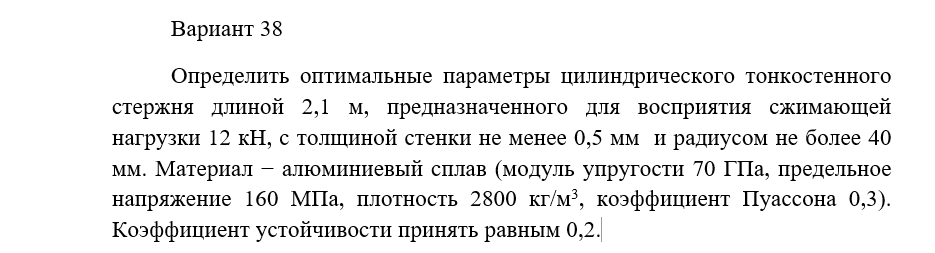 Определить оптимальные параметры цилиндрического тонкостенного стержня длиной 2,1 м, предназначенного для восприятия сжимающей нагрузки 12 кН, с толщиной стенки не менее 0,5 мм и радиусом не более 40 мм. Материал − алюминиевый сплав (модуль упругости 70 ГПа, предельное напряжение 160 МПа, плотность 2800 кг/м3, коэффициент Пуассона 0,3). Коэффициент устойчивости принять равным 0,2.