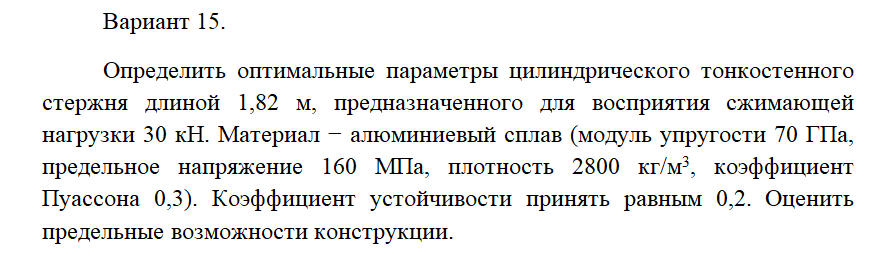 Задача: Определение оптимальных параметров стержня, работающего на сжатие вариант 15