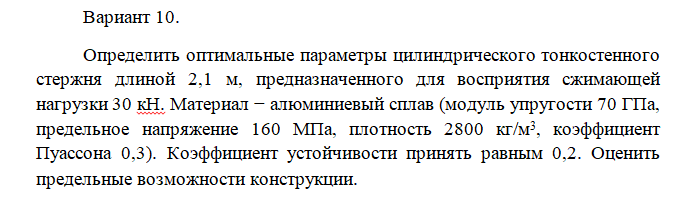 Задача: Определение оптимальных параметров стержня, работающего на сжатие вариант 10