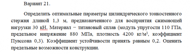 Задача: Определение оптимальных параметров стержня, работающего на сжатие вариант 21