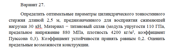 Задача: Определение оптимальных параметров стержня, работающего на сжатие вариант 27