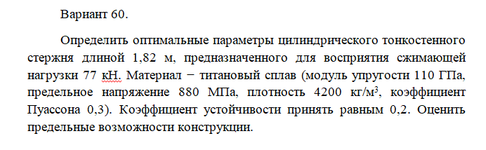 Задача: Определение оптимальных параметров стержня, работающего на сжатие вариант 60