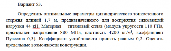 Задача: Определение оптимальных параметров стержня, работающего на сжатие вариант 53
