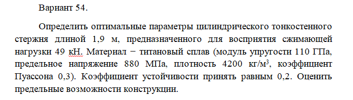 Задача: Определение оптимальных параметров стержня, работающего на сжатие вариант 54