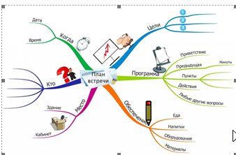 Пример интеллект-карты Семь правил интеллект-карт 1. Располагайте лист горизонтально 2. Всегда начинайте с центра 3. Рисуйте ветви от центра в стороны 4. Заключайте каждый ключевой блок в визуальную рамку 5. Показывайте иерархию и связь разными цветами 6. Выбирайте сильные слова для ключевых блоков 7. Пишите печатными буквами, если работаете на бумаге