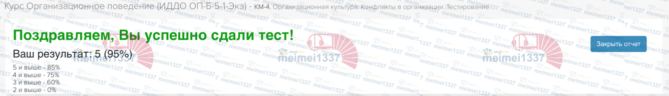 Для студентов ИДДО НИУ «МЭИ» по предмету Организационное поведениеОрганизационное поведение - КМ-4. Организационная культура. Конфликты в организации. Тестирование - 95%Организационное поведение - КМ-4. Организационная культура. Конфликты в организации. Тестирование - 95%