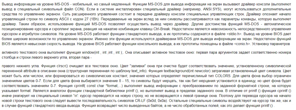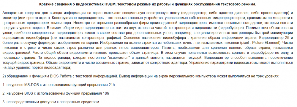 различных типов видеосистем. Ознакомиться с текстовым режимом отображения информации на экран монитора и стандартными библиотечными функциями C++, обслуживающими этот режим.