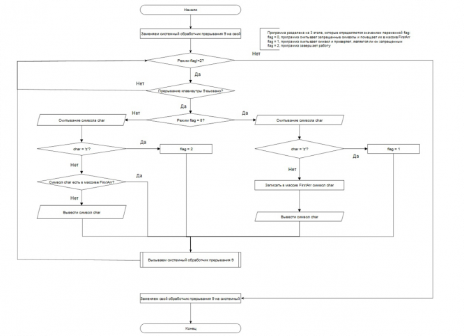 Задание: По заданию преподавателя разработать алгоритм и реализовать программу подключения собственной подпрограммы обработки прерывания и использовать её в цепочке со стандартной подпрограммой обработки прерывания от одного из следующих устройств компьютера: в нашем случае клавиатура. Сначала вводим символы, которые нельзя использовать. Затем при нажатии этих символов, они не отображаются.