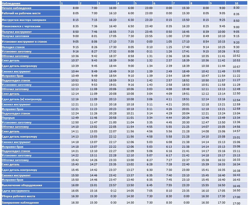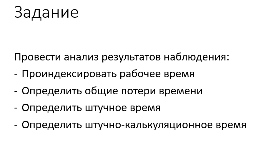 Показать/скрыть дополнительное описаниеПровести анализ результатов наблюдения: Проиндексировать рабочее время Определить общие потери времени Определить штучное время Определить штучно-калькуляционное время.