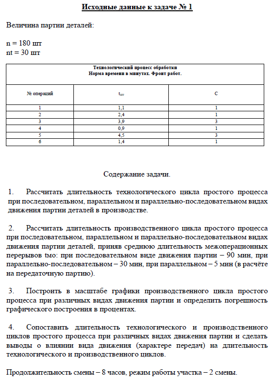 Представлена задача №1 из домашнего задания "Расчет производственного цикла. Расчет и планировка поточной линии"