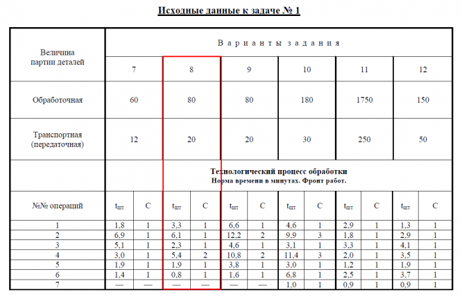 1. Технологический процесс с нормами времени tшт и фронтом работ С по операциям при-ведён в таблице «Исходные данные к задаче № 1 » (в соответствии с номером варианта).