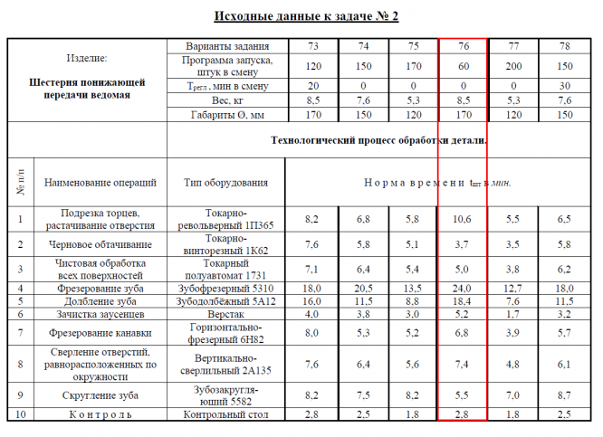 1. Технологический процесс обработки с нормами времени по операциям приведён в таблице «Исходные данные к задаче № 2 » (в соответствии с номером варианта).