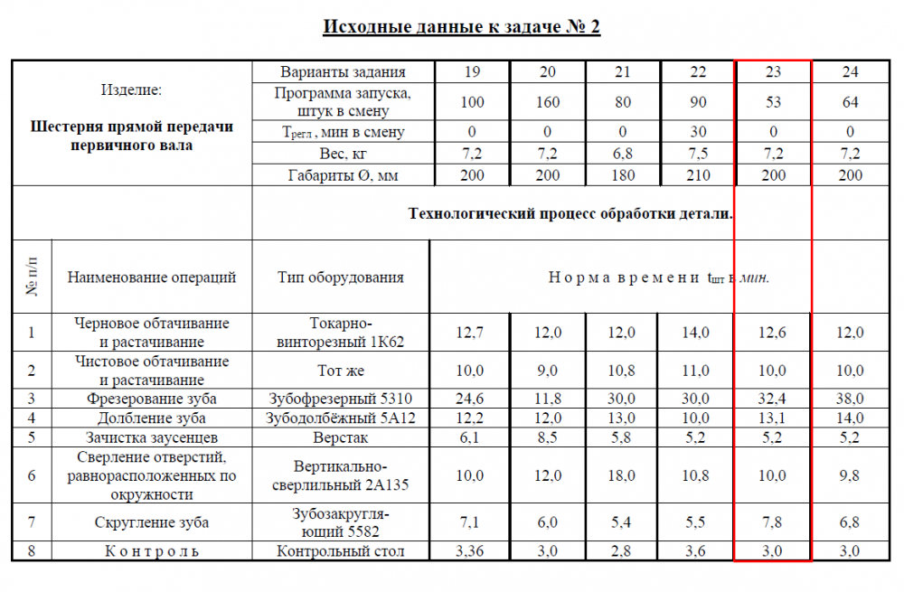 - Технологический процесс обработки с нормами времени по операциям приведён в таблице «Исходные данные к задаче № 2 » (в соответствии с номером варианта).