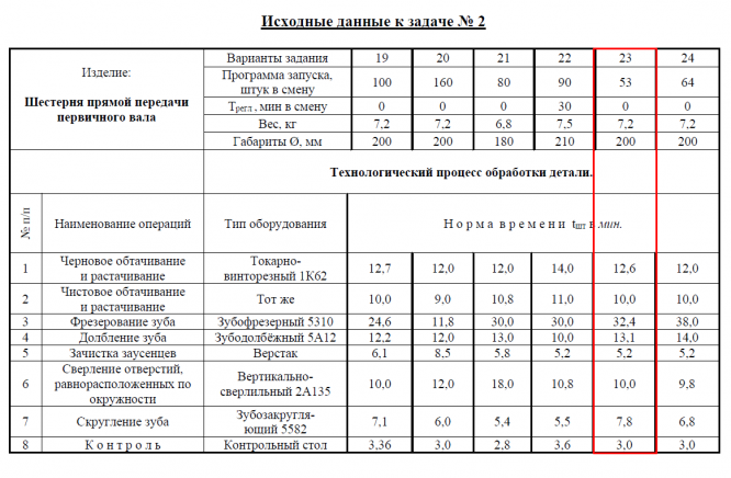 1. Технологический процесс обработки с нормами времени по операциям приведён в таблице «Исходные данные к задаче № 2 » (в соответствии с номером варианта).