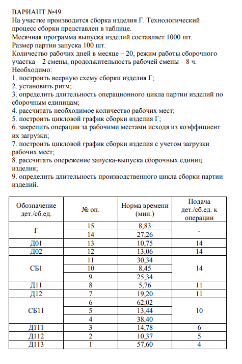 На участке производится сборка изделия Г. Технологический процесс сборки представлен в таблице. Месячная программа выпуска изделий составляет 1000 шт. Размер партии запуска 100 шт. Количество рабочих дней в месяце – 20, режим работы сборочного участка – 2 смены, продолжительность рабочей смены – 8 ч. Необходимо: 1. построить веерную схему сборки изделия Г; 2. установить ритм; 3. определить длительность операционного цикла партии изделий по сборочным единицам; 4. рассчитать необходимое количество рабочих мест; 5. построить цикловой график сборки изделия Г; 6. закрепить операции за рабочими местами исходя из коэффициент их загрузки; 7. построить цикловой график сборки изделия с учетом загрузки рабочих мест; 8. рассчитать опережение запуска-выпуска сборочных единиц изделия; 9. определить длительность производственного цикла сборки партии изделий