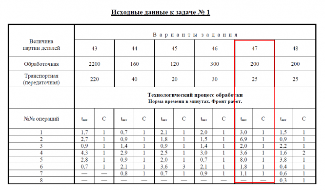 1. Технологический процесс с нормами времени tшт и фронтом работ С по операциям при-ведён в таблице «Исходные данные к задаче № 1 » (в соответствии с номером варианта).