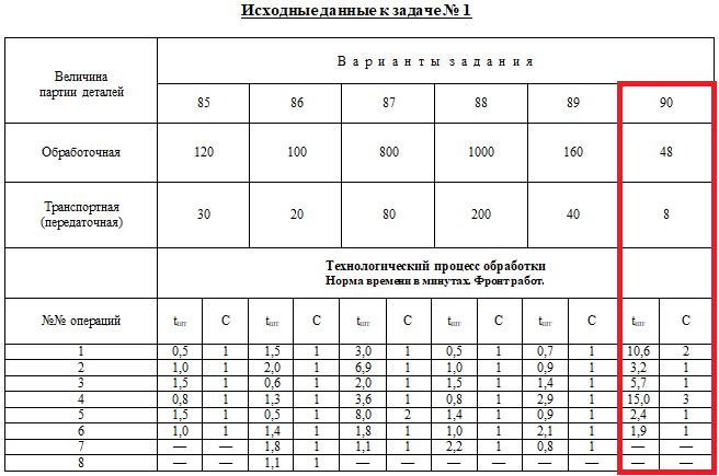 1. Технологический процесс с нормами времени tшт и фронтом работ С по операциям приведён в таблице «Исходные данные к задаче № 1 » (в соответствии с номером варианта).2. Продолжительность смены – 8 часов, режим работы участка – 2 смены.