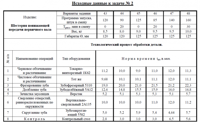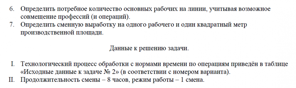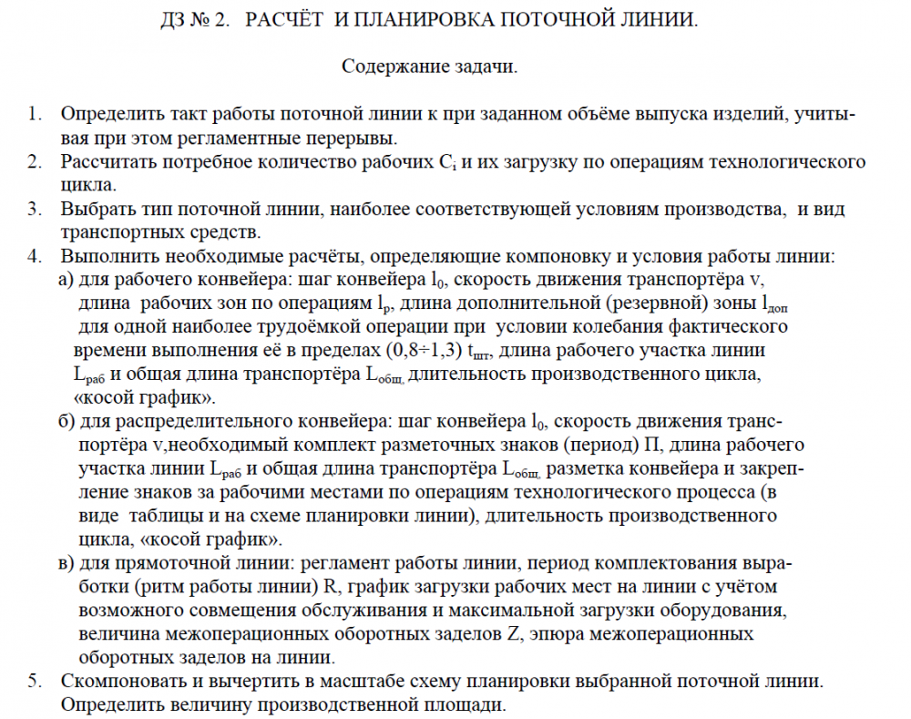 ДЗ № 2. РАСЧЁТ И ПЛАНИРОВКА ПОТОЧНОЙ ЛИНИИ. Содержание задачи. 1. Определить такт работы поточной линии к при заданном объёме выпуска изделий, учитывая при этом регламентные перерывы. 2. Рассчитать потребное количество рабочих Сi и их загрузку по операциям технологического цикла. 3. Выбрать тип поточной линии, наиболее соответствующей условиям производства, и вид транспортных средств. 4. Выполнить необходимые расчёты, определяющие компоновку и условия работы линии: а) для рабочего конвейера: шаг конвейера l0, скорость движения транспортёра v, длина рабочих зон по операциям lр, длина дополнительной (резервной) зоны lдоп для одной наиболее трудоёмкой операции при условии колебания фактического времени выполнения еѐ в пределах (0,8÷1,3) tшт, длина рабочего участка линии Lраб и общая длина транспортёра Lобщ, длительность производственного цикла, «косой график».